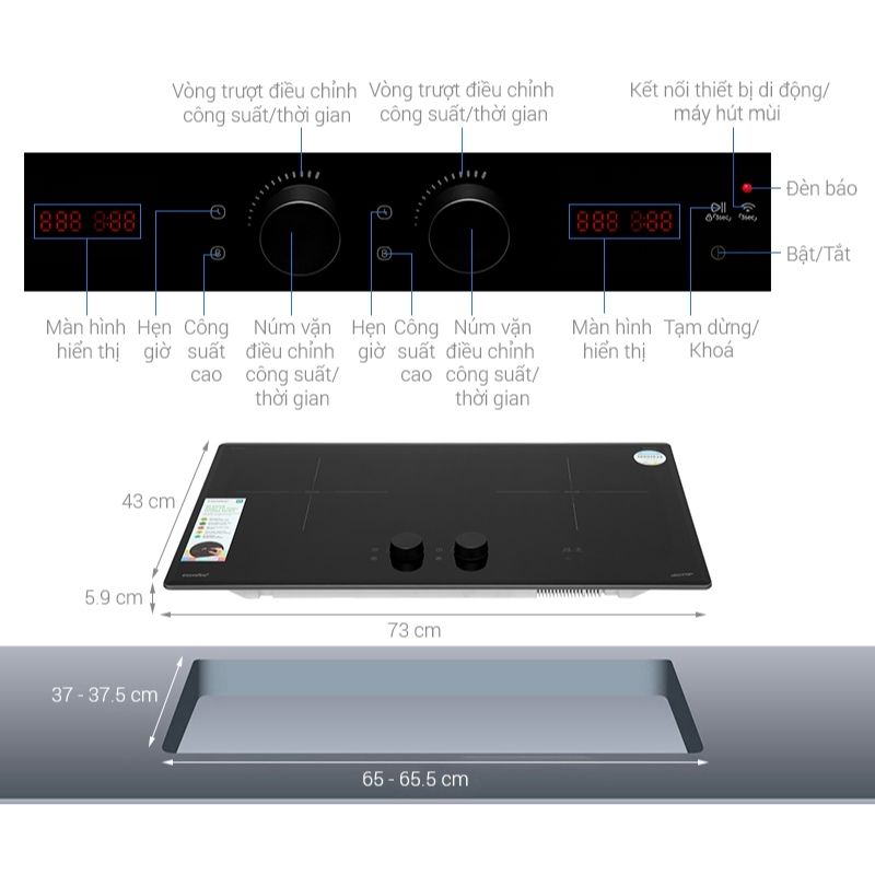 - Công suất mỗi vùng nấu 2100W, tăng cường lên 3300W khi kích hoạt Booster