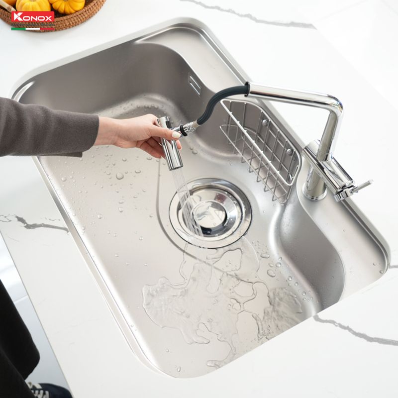 - Trang bị tay thoát tràn kèm logo Konox dạng vuông trên thành chậu, hỗ trợ thoát nước nhanh hơn, rút ngắn 30% thời gian xả thải.