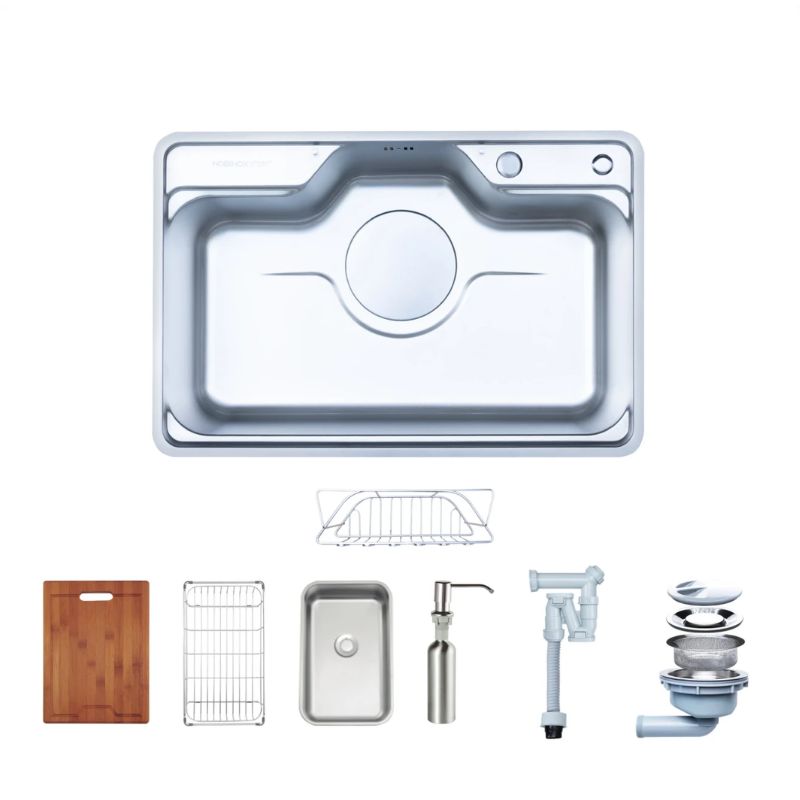- Phụ kiện đi kèm đầy đủ: Sản phẩm gồm thớt tre, rổ inox, khay inox và bình đựng nước rửa bát, hỗ trợ tối đa cho quá trình sơ chế và rửa dọn hằng ngày.