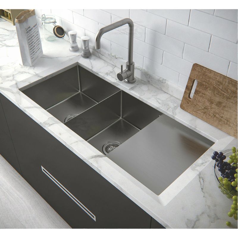 - Thiết kế 2 hố cân kèm bàn chờ tiện dụng: Cho phép thực hiện nhiều thao tác cùng lúc, đồng thời có thể lắp âm hoặc bán âm mặt đá, tối ưu không gian bếp mà không vướng víu.