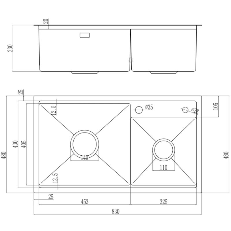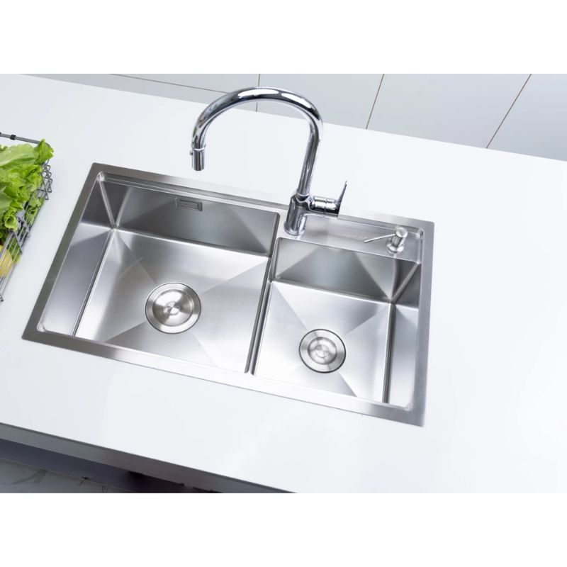 - Thiết kế 2 hố lệch thông minh: Hai hố không đối xứng kết hợp đường cong mềm mại, tiện lợi cho nhiều công việc bếp cùng lúc, từ rửa rau củ, xoong nồi đến sơ chế thực phẩm, đồng thời hài hòa với các phong cách bếp hiện đại.