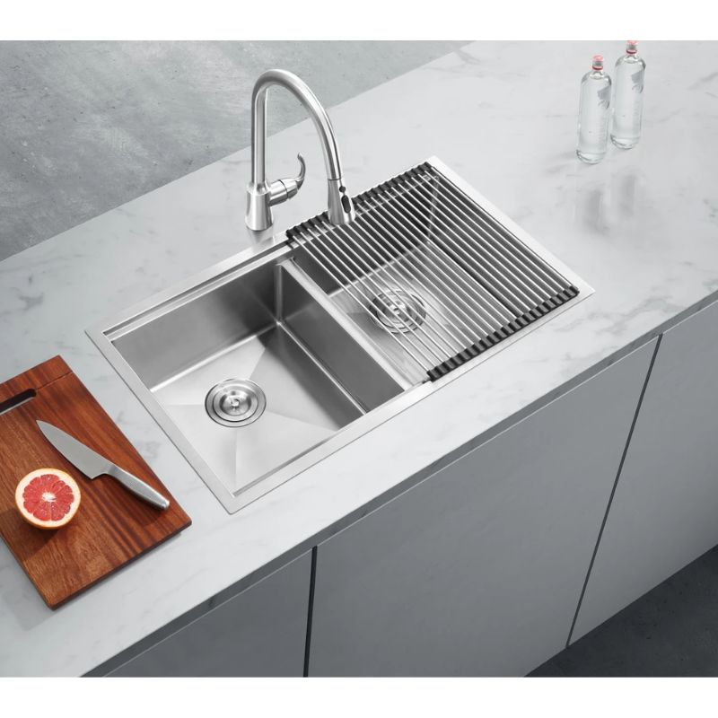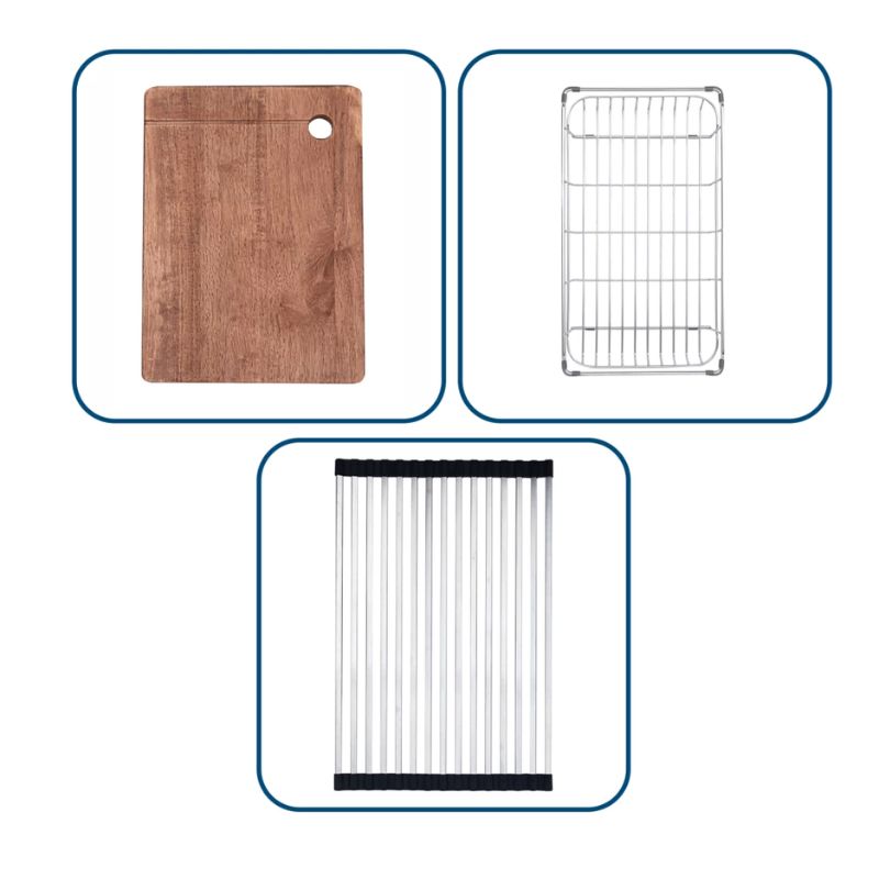- Giật cấp tích hợp phụ kiện – Nấu nướng gọn gàng: Chậu được thiết kế giật cấp tinh xảo, tích hợp các phụ kiện đi kèm như thớt, rổ LK, khay phụ, bình đựng nước rửa… giúp quy trình sơ chế, rửa và để ráo trở nên nhanh chóng, thuận tiện và giữ bếp luôn ngăn nắp.