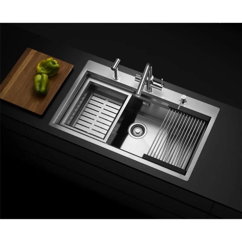 - Gờ hạ bậc Slide thông minh: Thiết kế rãnh trượt cho phép phụ kiện di chuyển mượt mà trong lòng chậu, hỗ trợ tối đa thao tác rửa, sơ chế và sắp xếp thực phẩm, từ đó nâng cao hiệu quả sử dụng không gian bếp.
