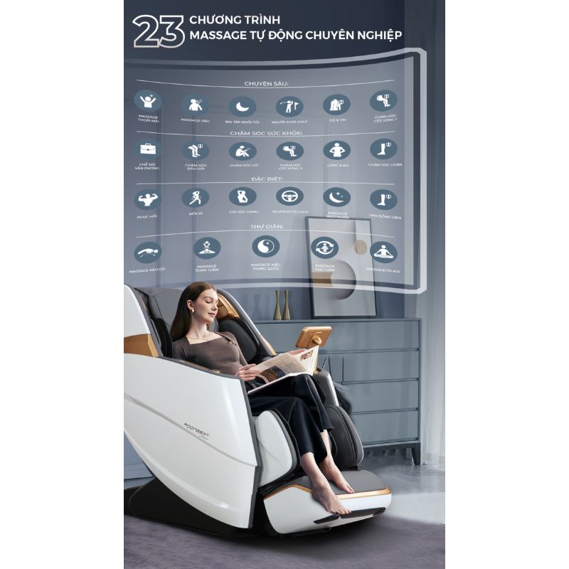 24 chế độ massage phù hợp với mọi nhu cầu: Ghế massage Poongsan MCP 806 được trang bị đến 24 chế độ massage tự động, đáp ứng đa dạng nhu cầu của người dùng. Mỗi chế độ đều có những đặc điểm riêng, tập trung vào các vùng cơ thể khác nhau và mang lại những hiệu quả riêng biệt. Các lựa chọn đa dạng bao gồm: Massage theo cường độ: Massage nhẹ nhàng, Massage chuyên sâu. Massage theo thời điểm: Buổi sáng, Buổi tối. Massage chuyên sâu theo vùng: Massage cổ, Massage lưng, Massage chân, Massage toàn thân. Massage theo kỹ thuật: Xoa bóp, Vỗ nhẹ, Day ấn, Kéo giãn, Nhiệt hồng ngoại.