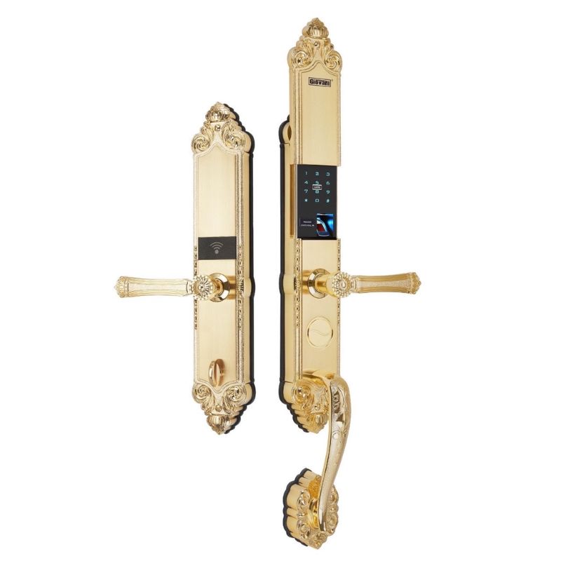 Khóa cửa thông minh vân tay hợp kim kẽm màu vàng sở hữu thiết kế hiện đại, sang trọng cùng độ bền cao, phù hợp cho nhiều không gian như căn hộ, nhà phố hay biệt thự. Sản phẩm tích hợp đa dạng phương thức mở khóa như vân tay, mật khẩu, thẻ từ, app WiFi và chìa cơ, mang đến sự tiện lợi và an toàn tối đa cho người dùng.