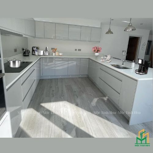 Mẫu tủ bếp nhựa cánh Acrylic TBNA07 được Mộc Tinh Hoa thi công thực tế tại nhà khách. Tủ bếp được thiết kế theo dáng chữ U hiện đại, nổi bật với gam màu ghi tinh tế, kết hợp cùng hệ tủ thông minh và không gian lưu trữ tối ưu, mang lại sự tiện nghi tối đa cho căn bếp gia đình.