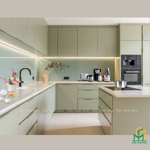 Mẫu tủ bếp nhựa cánh Acrylic TBNA08 được Mộc Tinh Hoa thi công thực tế tại nhà khách. Tủ bếp này được thiết kế theo kiểu dáng chữ L hiện đại, nổi bật với gam màu xanh trang nhã, kết hợp cùng hệ tủ thông minh, mang đến sự tiện nghi tối đa cho không gian bếp của gia đình bạn.