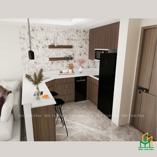Mẫu tủ bếp nhựa cánh Melamine TBNM03 được Mộc Tinh Hoa thi công thực tế tại nhà khách. Nổi bật với thiết kế chữ U màu nâu sang trọng, tối ưu không gian và lưu trữ. Cánh tủ bóng mờ, tay nắm tối giản cùng bố cục thông minh kết hợp kệ mở và tủ kín linh hoạt.