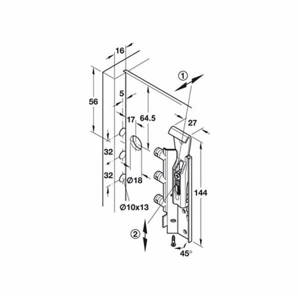 Thông số kĩ thuật của phụ kiện bas treo tủ lắp nhấn khóa vít, bên phải Hafele 290.21.911